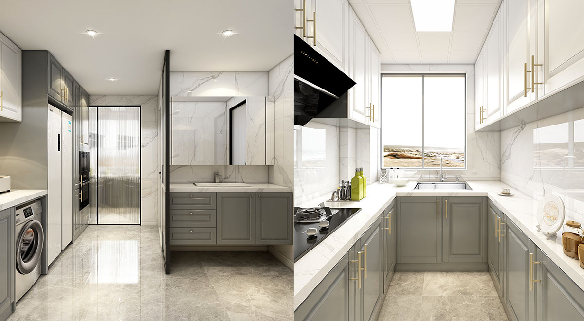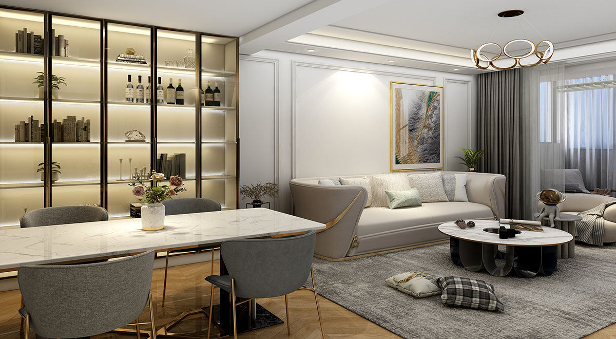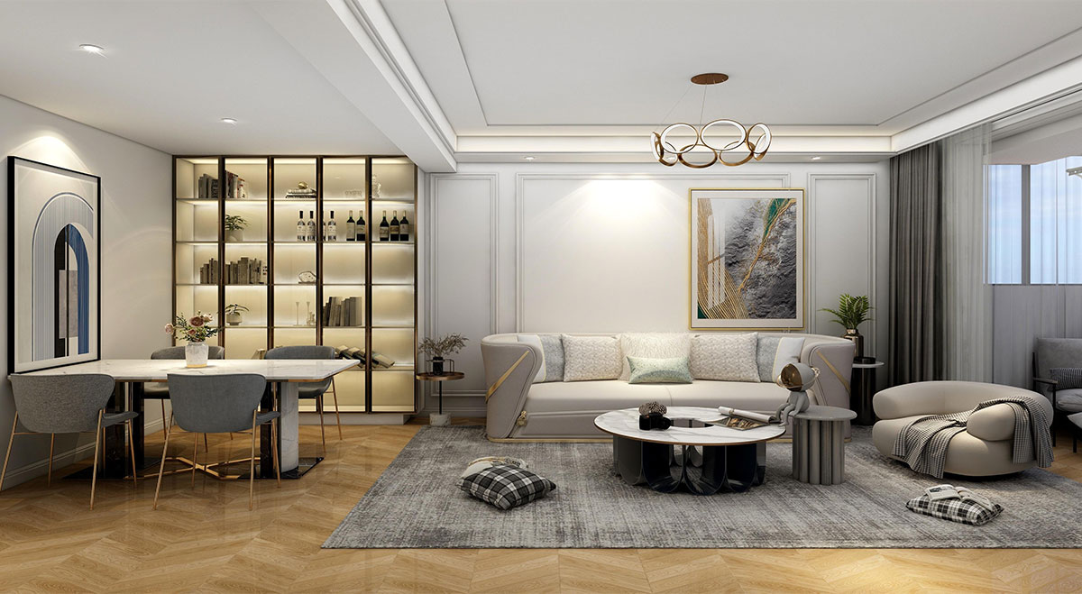 本案是舊房改造,常住人口是一對(duì)時(shí)尚的中年夫妻。業(yè)主的訴求是希望擴(kuò)大客廳的視覺(jué)面積。布局上我們把衛(wèi)生間往北推,廚房改成中西廚,客餐廳融為一體。風(fēng)格上以美式輕奢為格調(diào),巧妙運(yùn)用優(yōu)雅簡(jiǎn)潔的白色石膏線造型,加以點(diǎn)綴金色線條,讓空間揮發(fā)著自由與貴氣。細(xì)膩的線條,優(yōu)雅的結(jié)構(gòu),塑造不同一般的居室美感。